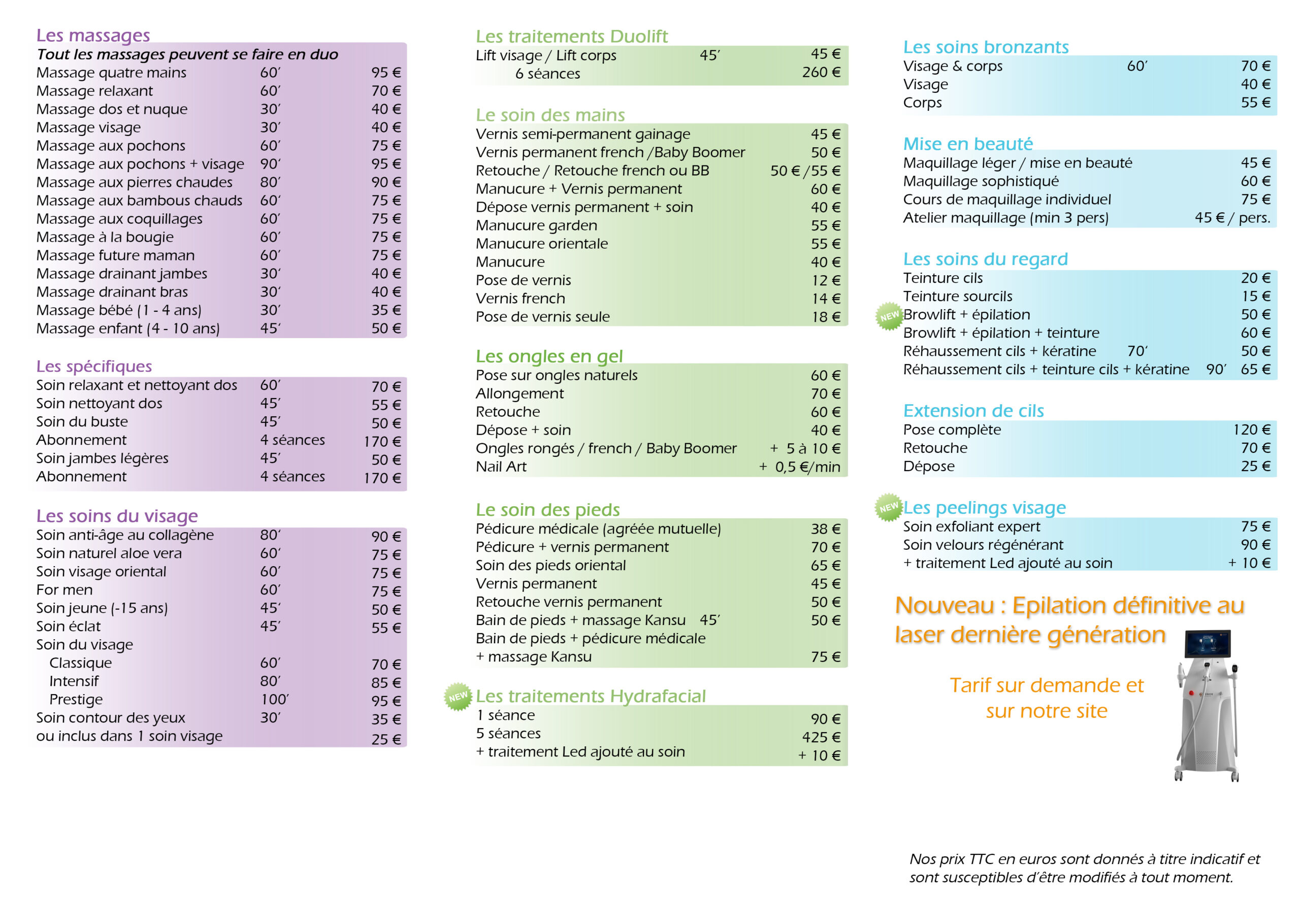 Nos prix TTC en euros sont donnés à titre indicatif et sont susceptibles d’être modifiés à tout moment. Seuls les prix figurant sur le bon de commande dûment accepté sont fermes et définitifs.